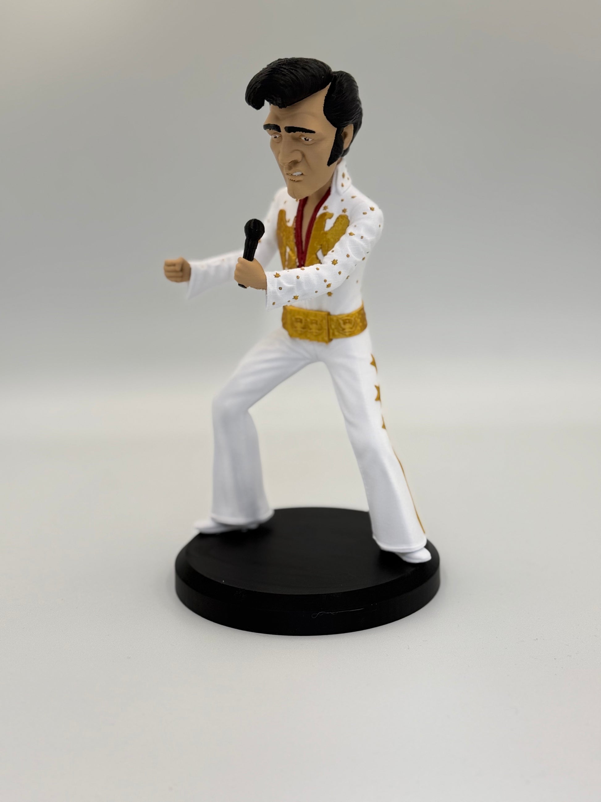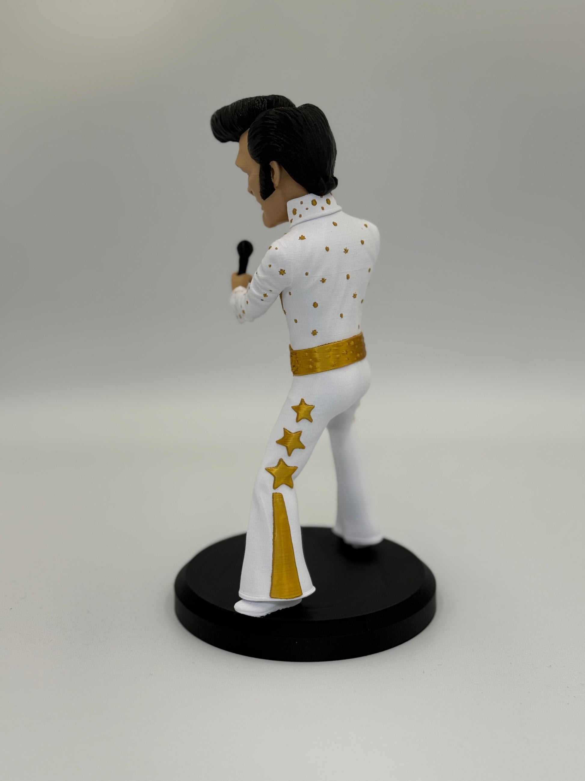 Long live The King! This 10.5-inch mini edition brings the legendary rocker to life—pompadour, flashy outfit, and all. Capturing that electrifying stage energy in a compact collectible, this fan-made statue is perfect for anyone who knows a little less conversation and a lot more action goes a long way.